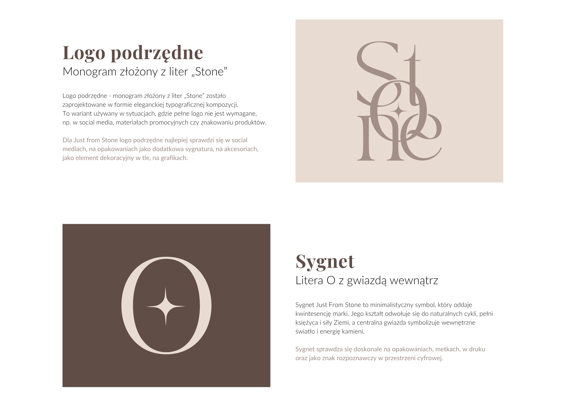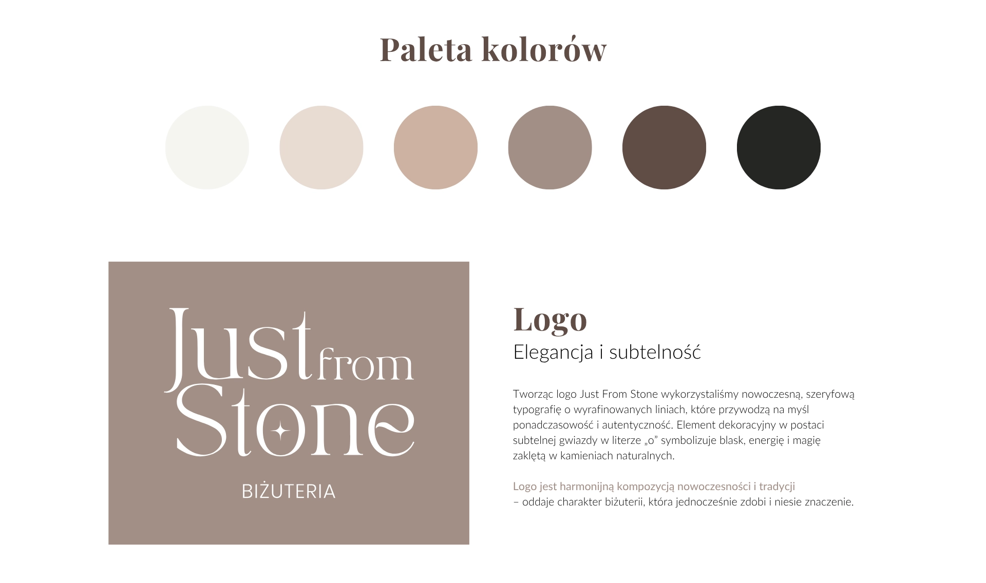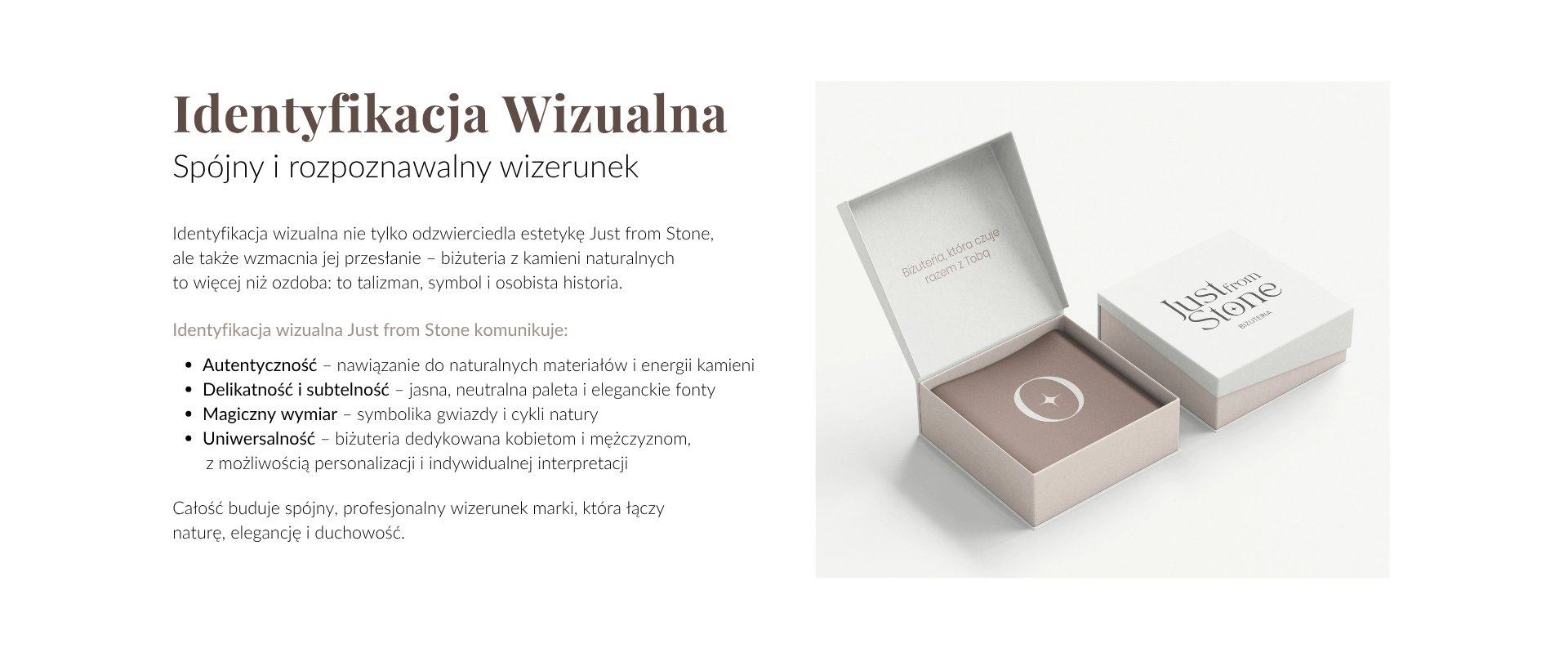 Dla marki Just From Stone – tworzącej wyjątkową biżuterię z kamieni naturalnych – zaprojektowaliśmy kompleksową identyfikację wizualną, która oddaje filozofię marki: autentyczność, subtelność i harmonię z naturą. Przygotowaliśmy eleganckie logo główne, logo podrzędne oraz sygnet. Całość uzupełnia spójna paleta barw inspirowana ziemią i naturalnymi minerałami, a także zestaw typografii łączący klasyczną elegancję z nowoczesną czytelnością. Dzięki temu marka zyskała unikalny i profesjonalny wizerunek, który wyróżnia ją na rynku biżuterii handmade.